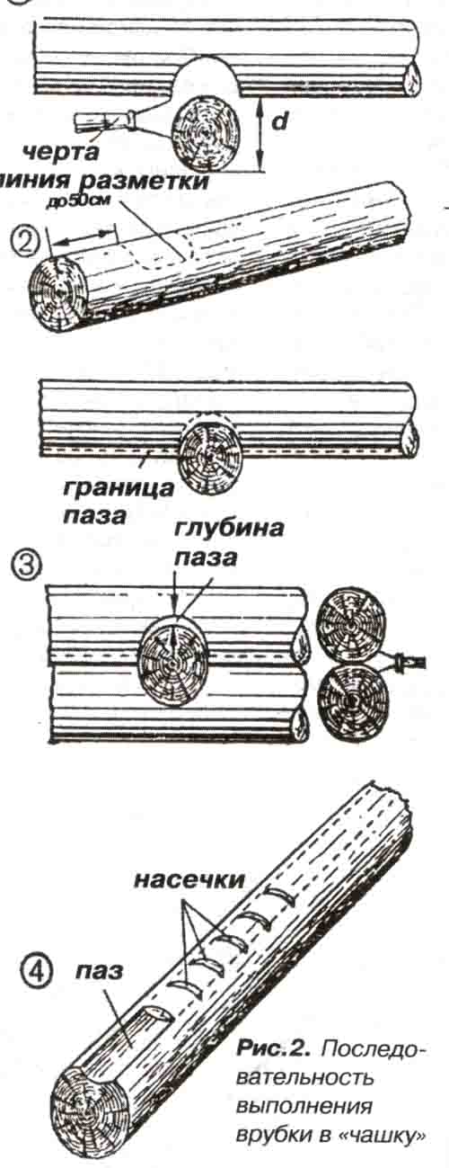 Последовательность сборки венцов при рубке в "чашку" следующая. Для начала на два противоположных бревна окладного нижнего венца укладывают по бревну следующего и вырубают в них чашки в полдиаметра нижних бревен и по всей их длине выбирают аз. Затем бревна переворачивают и укладывают в рабочее положение. Чтобы правильно разметить профиль "чашки", в момент, когда поперечное бревно лежит на продольном, используют так называемую "черту" - циркуль плотника. Одну ножку черты ведут по окружности нижнего бревна, а другой прочерчивают полудугу на поверхности верхнего - поперечного бревна. Раствор "циркуля" при этом должен быть равен половине диаметра нижнего бревна. Паз размечают по низу верхнего бревна, уложенного на нижнее